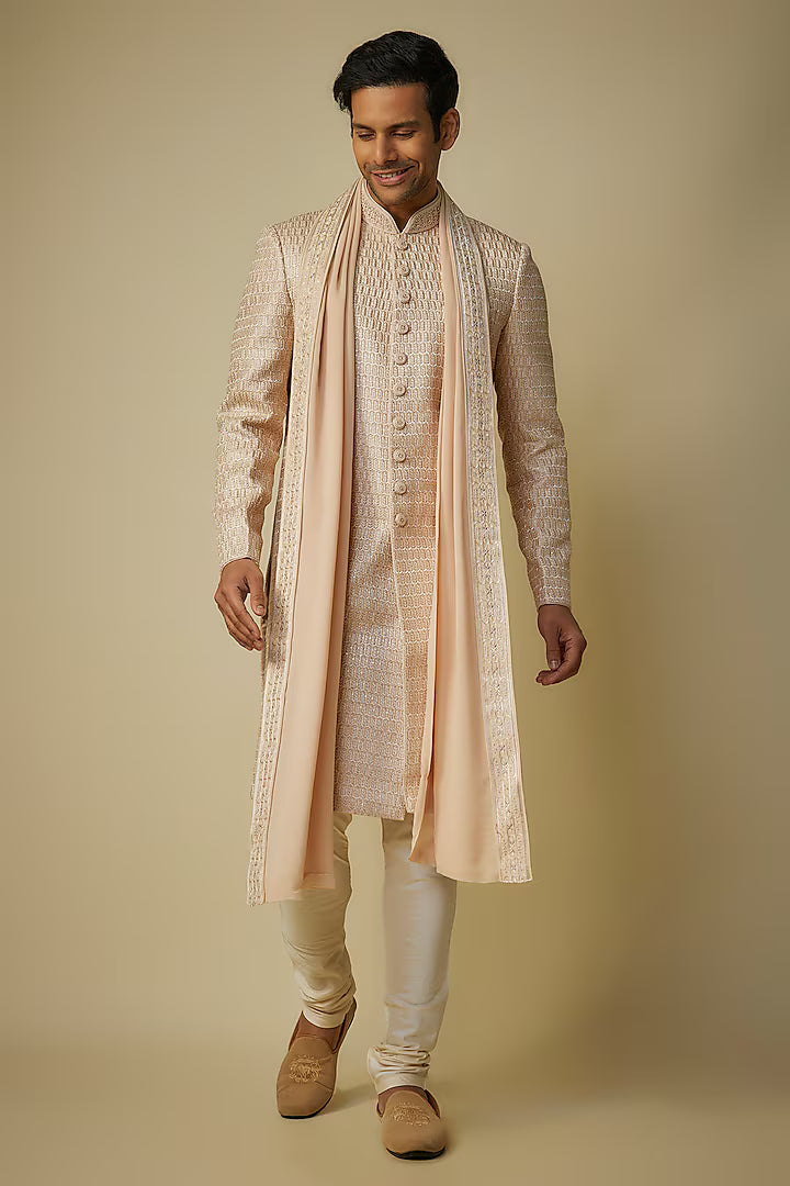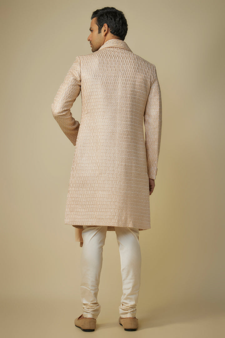 Beige Silk Embroidered Sherwani Set