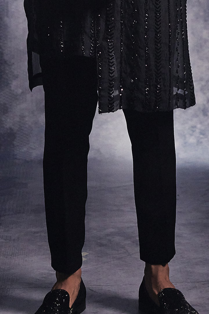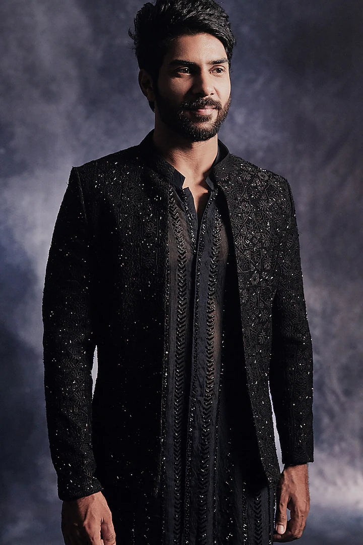 Ebony Black Poly Blend Suiting Embroidered Indo-Western Set