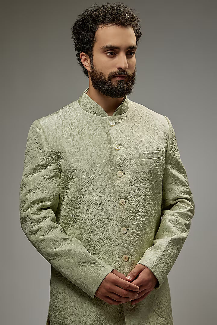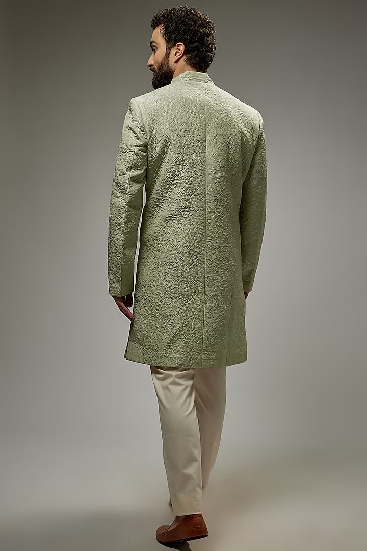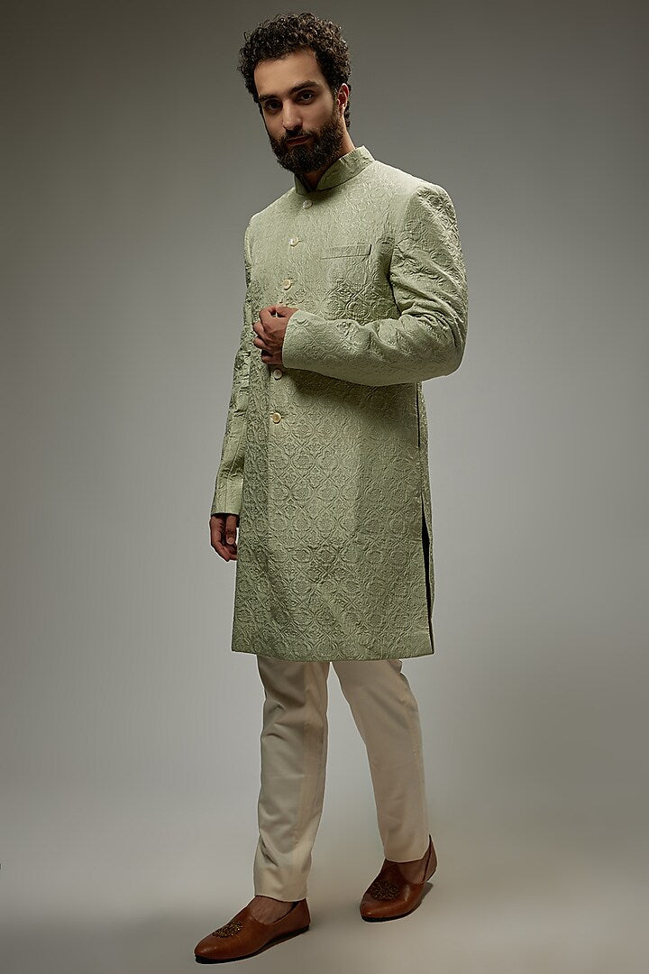 Mint Green Silk Embroidered Sherwani Set