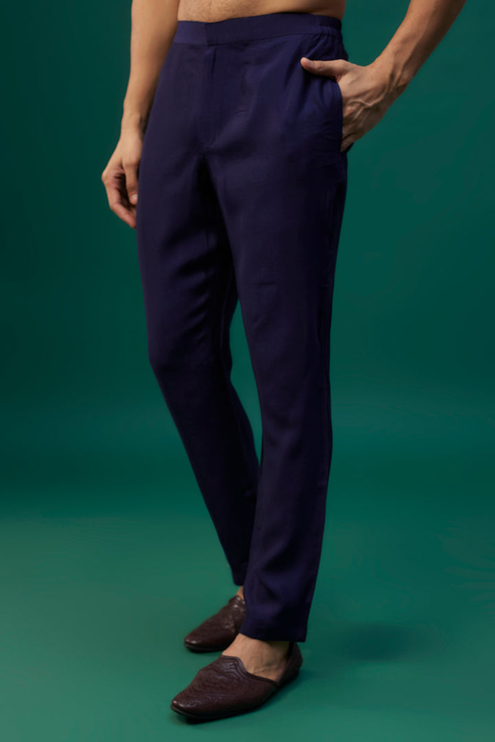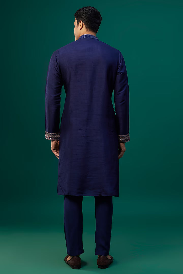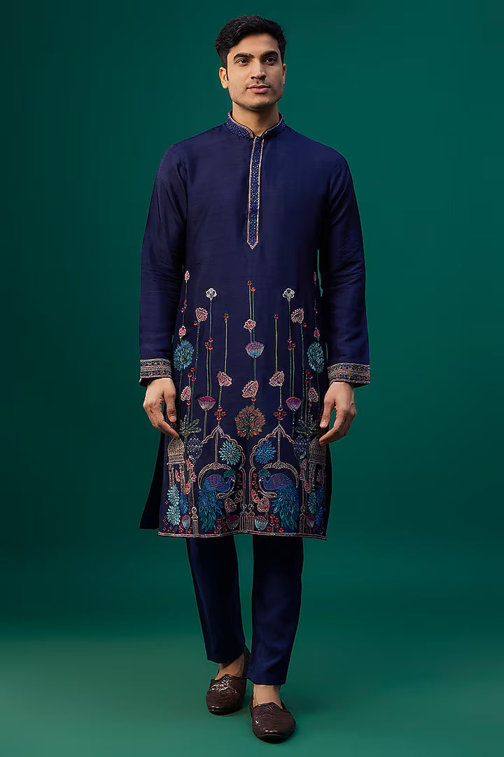 Navy Blue Tussar Resham Hand & Machine Embroidered Kurta Set