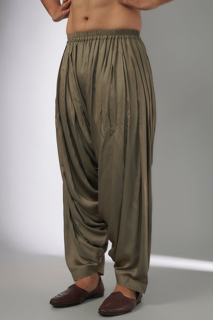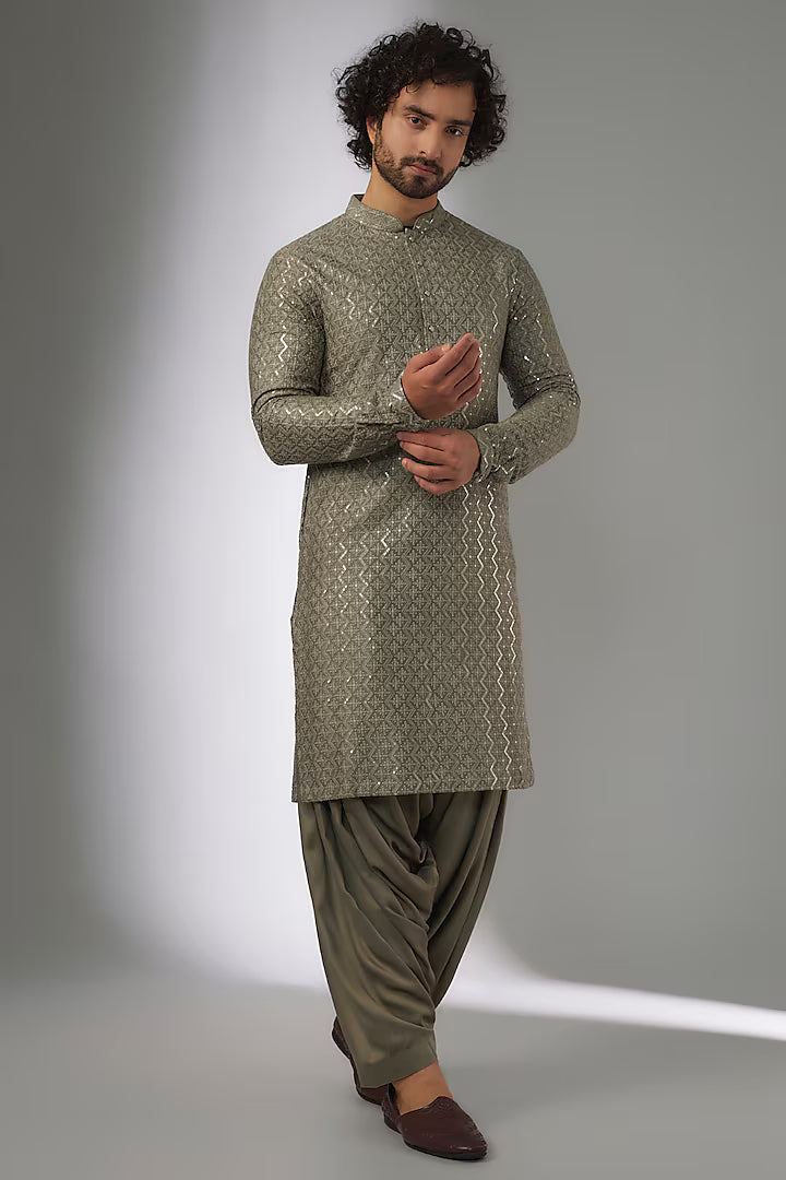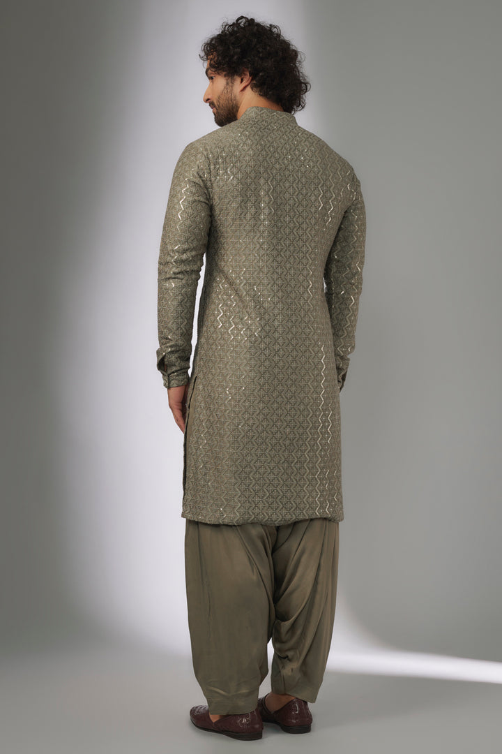 Olive Green Dola Silk Thread & Sequins Embellished Kurta Set