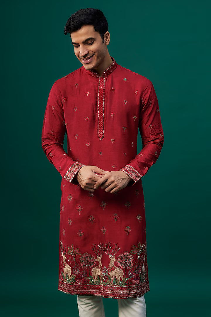 Red Tussar Resham Hand & Machine Embroidered Kurta Set