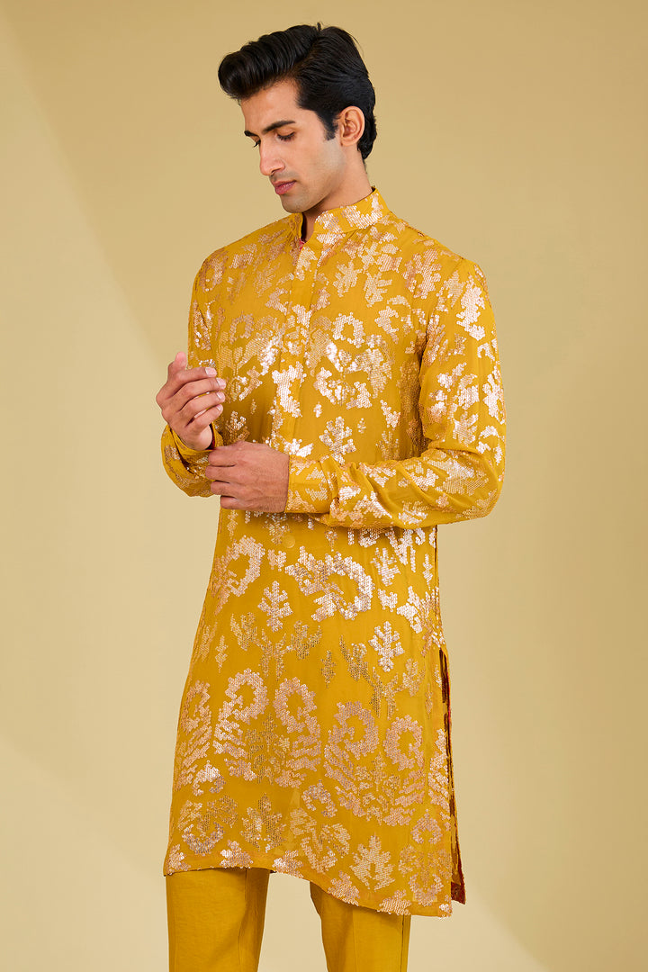 Yellow Georgette Sequins Embroidered & Printed Kurta Set
